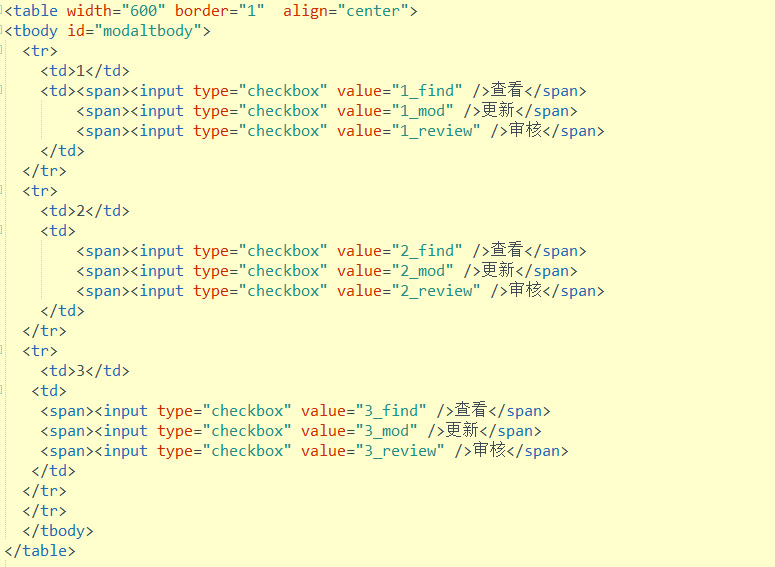 思路:根據(jù)value值來判斷,查看權(quán)限的value值會包含_find、更新權(quán)限的value值包含_mod、審核權(quán)限的value包含_review,在點擊checkbox的點擊事件上操作。